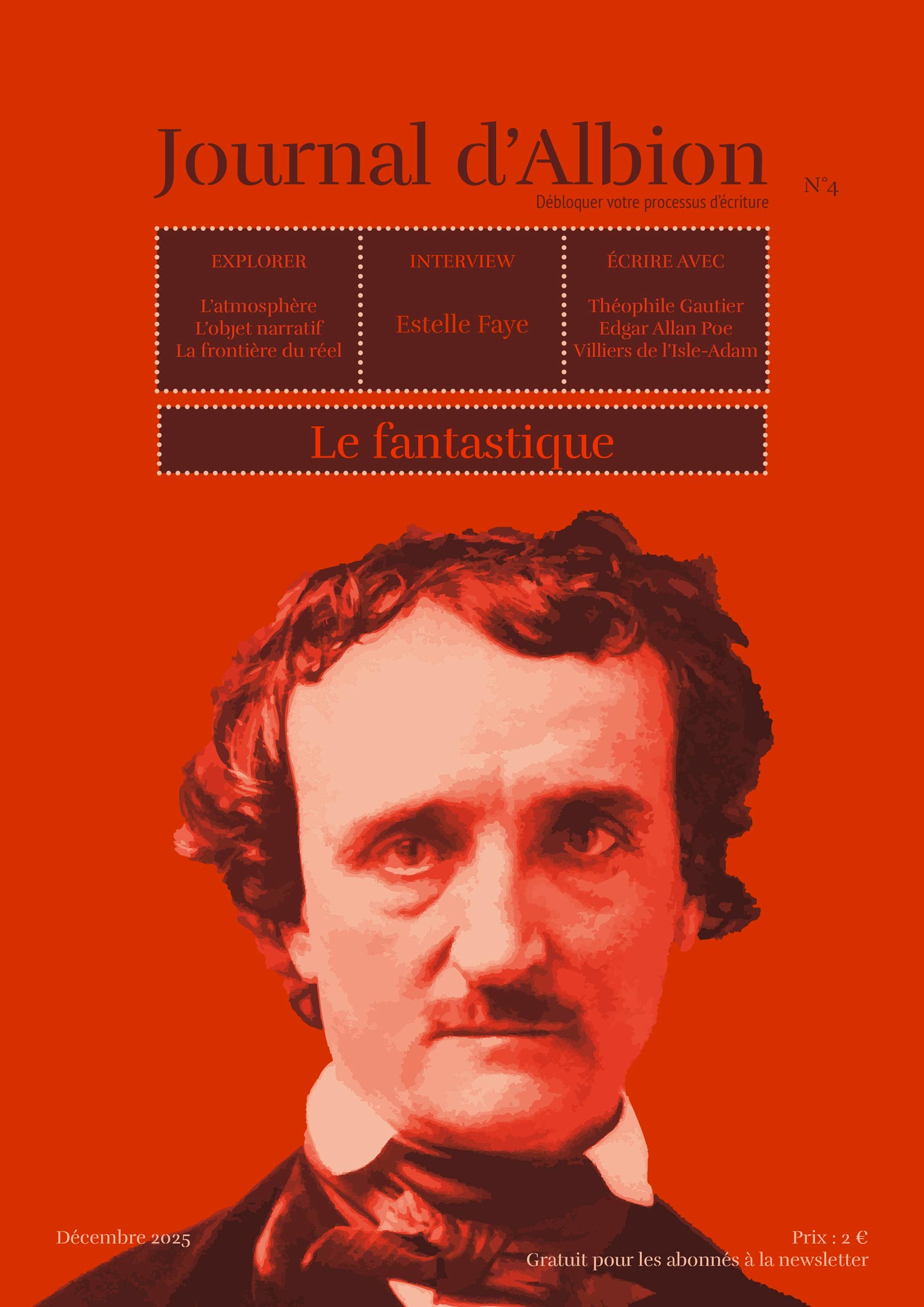 Dans ce quatrième numéro du Journal d’Albion, nous explorons le genre du fantastique. Au travers d’extraits choisis (Villiers de l’Isle-Adam, Théophile Gautier, Edgar Allan Poe), nous vous proposons des exercices d’écriture autour de l’atmosphère, de l’objet narratif et de la frontière entre le réel et l’imaginaire. Deux pages sont également consacrées à des conseils de lecture et d’écriture. Enfin, un grand entretien avec Estelle Faye nous permet de plonger dans l’art de l’entremêlement des genres de l’étrange.